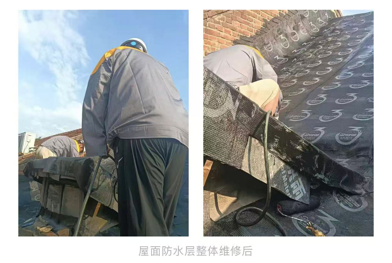 为了彻底解决渗漏问题,洪雨安居卫士制定了精准维修方案:拆除原有老化防水层后,重新铺设SBS改性沥青防水卷材,并增加卷材在立面上的上返高度,同时对屋面阴阳角、管道根部等易渗漏的特殊部位进行复加防水处理,从根源上阻断渗水路径。